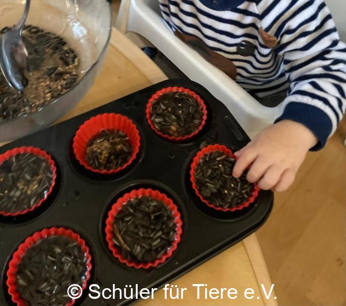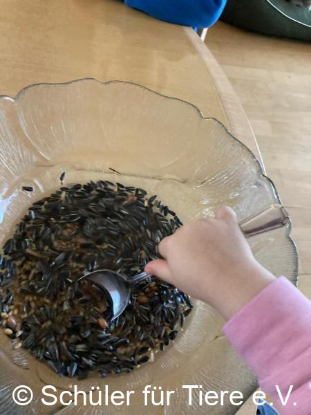 Ob Sonnenblumenkerne abfüllen, Fett vorsichtig vermengen oder die fertigen Futteranhänger im Garten platzieren – hier war echte Begeisterung spürbar. Ein wunderschönes Beispiel dafür, wie frühe Natur- und Tierschutzbildung aussehen kann.