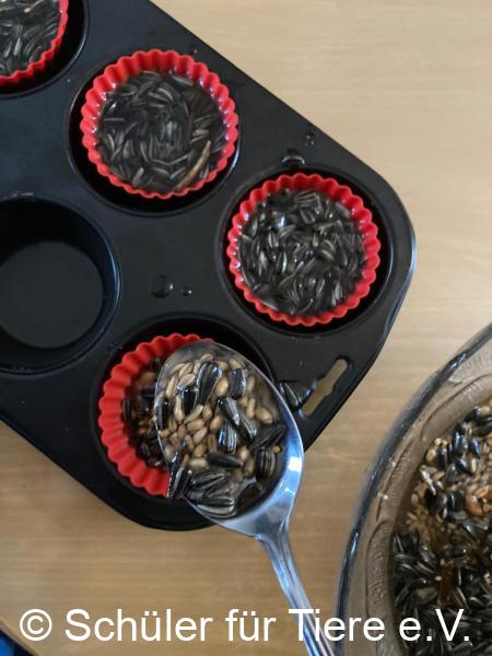 Gemeinsam wurde Vogelfutter vorbereitet, abgefüllt, geformt und schließlich draußen aufgehängt.